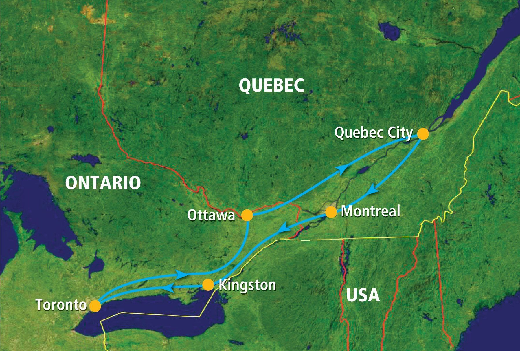 Lower and Upper Canada is a journey through the urban centres and rural splendor of Ontario and Quebec, celebrating Canada’s English and French heritage. Travel from cosmopolitan Toronto and the natural wonder of Niagara Falls to the national capital of Ottawa. Then, cross into Quebec and explore Montreal, the second-largest French-speaking city in the world. The route continues along the St. Lawrence River to the walled centre of Quebec City before turning inland to the Saguenay region. Traverse the rolling hills and dense forests of the Mauricie / Bois-Francs region before crossing back into Ontario and spending a night in historic Kingston. Following the shoreline of Lake Ontario through the eastern townships, the tour concludes in upon arrival in Toronto.